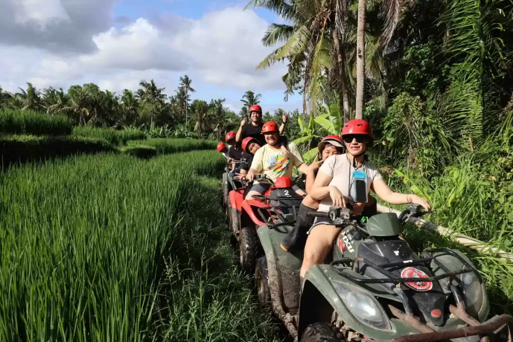 Explore this tropical paradise as you discover its varied landscapes, lush rice paddies, overgrown jungles, and rushing rivers on an ATV Quad bike adventure. Experience a convenient pickup at your accommodation by your English-speaking guide and head to the starting point in Ubud. You will be given a thorough safety briefing and all the equipment needed for a safe journey.hoose to either ride in tandem with a companion or drive your own ATV. Be treated to the spectacular sight of Bali’s natural beauty as you move through and around the extensive track. If you’re up for a bit more thrill, just let your guide know, and they’ll take you to a more technical terrain where you can make your way up steep hills at full speed or slide down slopes as you please. After an exciting ride, freshen up with a relaxing shower before feasting on a buffet meal of scrumptious food. Be dropped off safely back at your hotel to enjoy the rest of your day. Or simply go and leave by your own means.. This tour include half day Ubud tour like visit Tegalalang Rice Terrace, Monkey Forest or Ubud Market before back to hotel